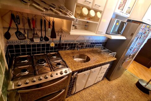 Pia da cozinha em granito e com ducha quente para apoio. Piso da cozinha em granito.