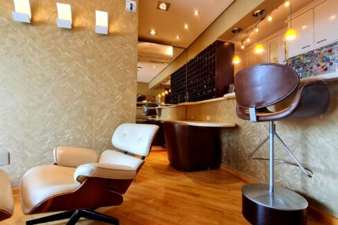 Cozinha americana com Bancada de mármore importado crema marfim e bancos altos giratórios em couro natural.